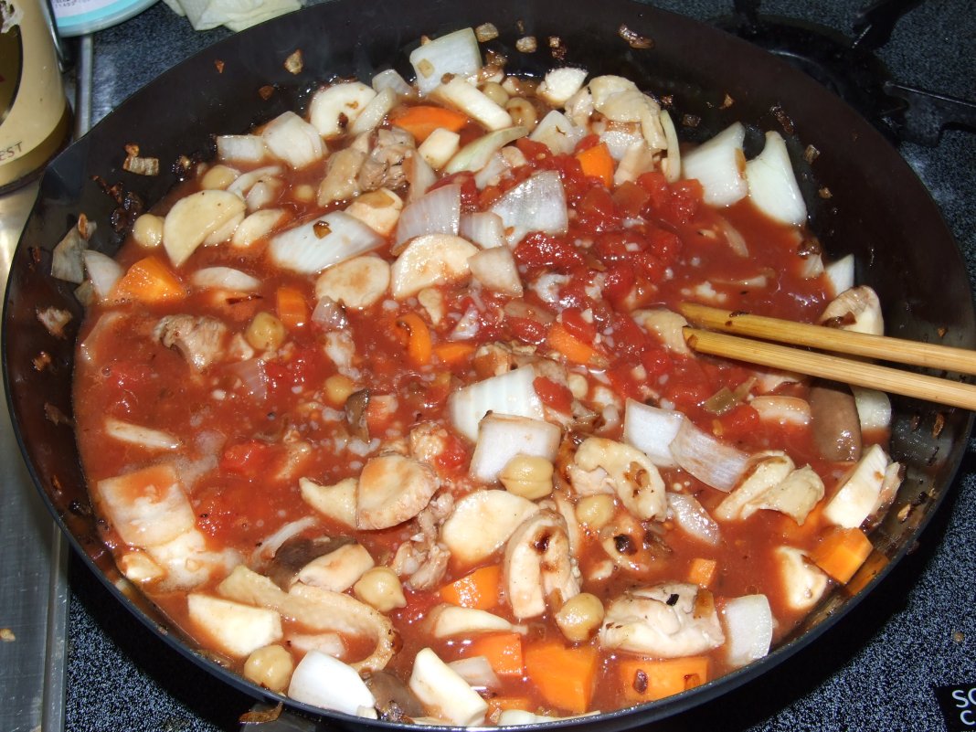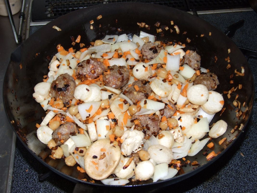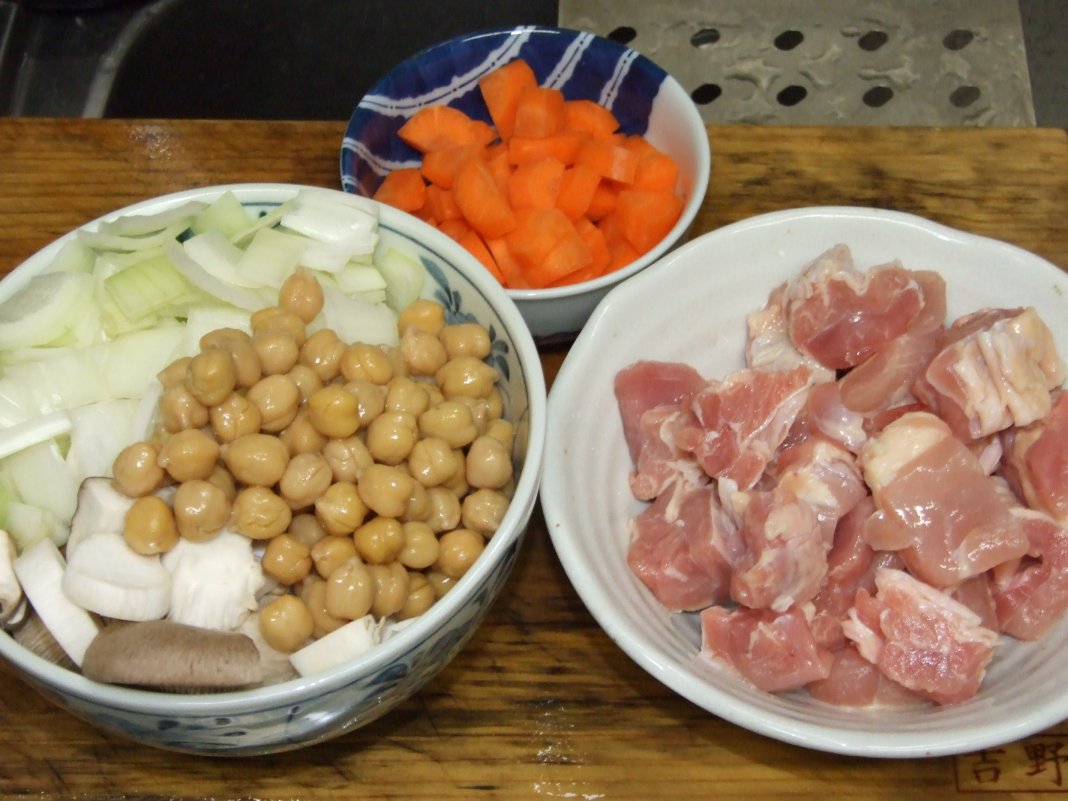 順番は、肉→硬い野菜(ここでは人参)→柔らかい野菜(ここでは玉葱エリンギひよこ豆)の順番です。