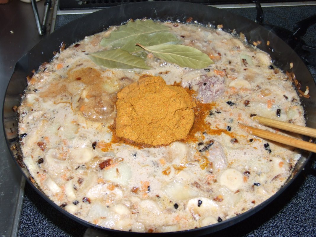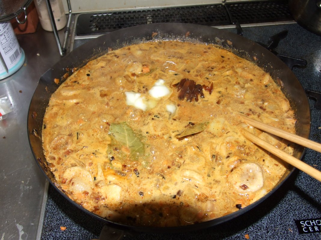 前回はもう少し細かく段階を追っていたのですが、今回はこの時点でギー(インド発酵バター)とマンゴチャツネ、すりおろし生姜などを入れてしまいました。