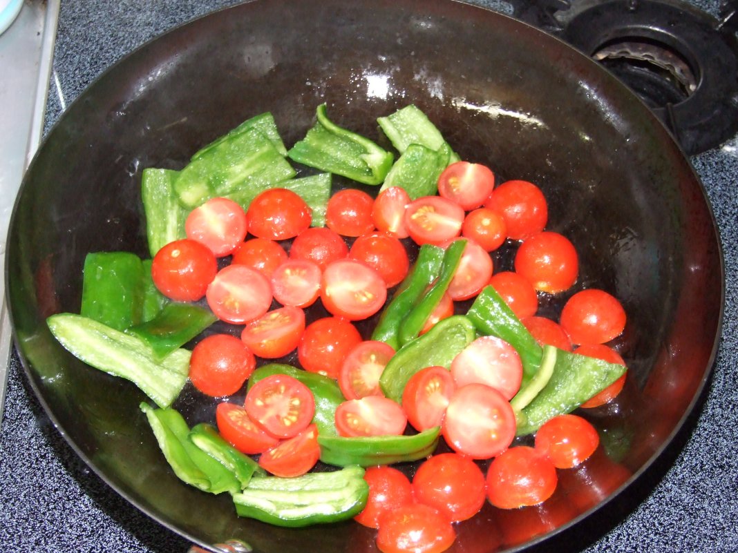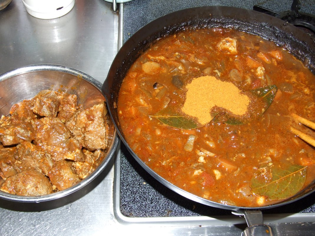 アメタマが出来たら、テンパリングで作ったスパイス油を入れて、細切れ肉と野菜を炒めます。