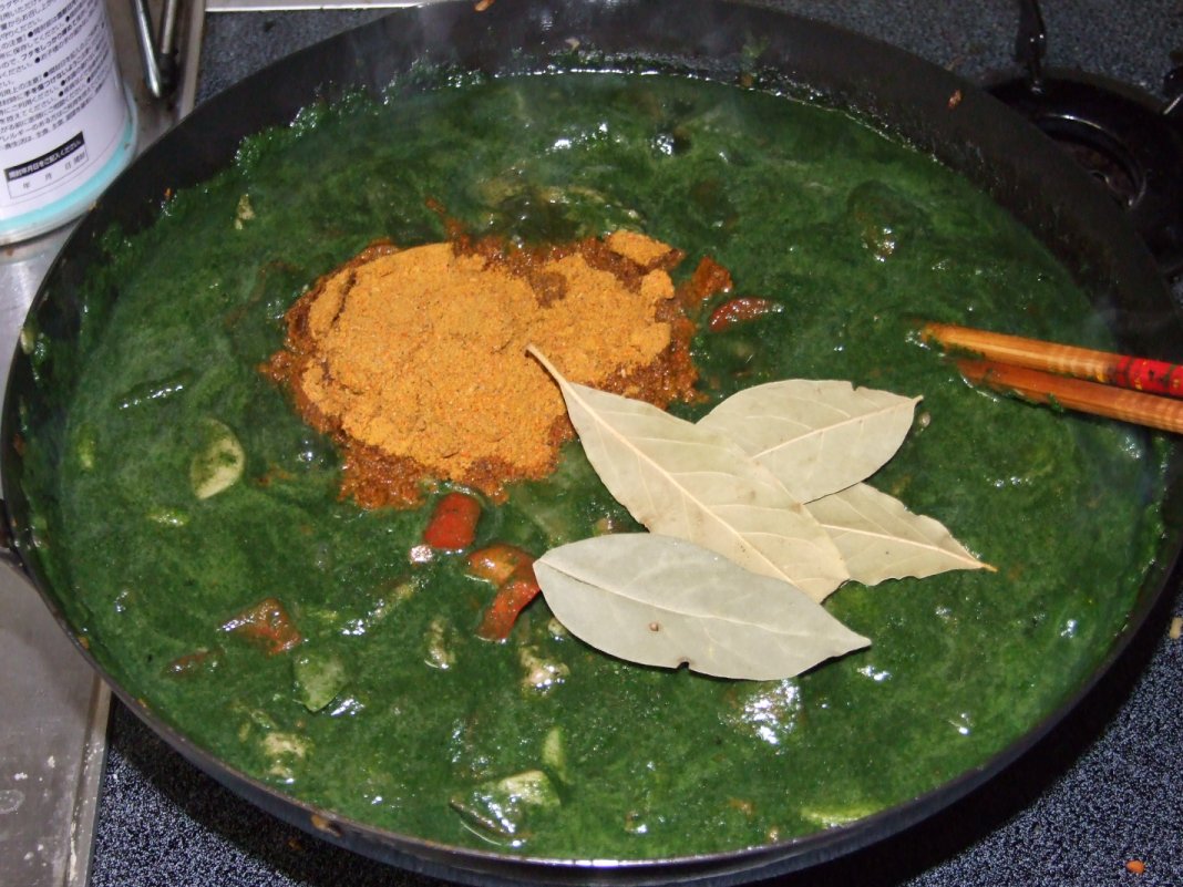 右下のスパイスは後述するテンパリング用のスタータースパイスです。ローレル二枚分、クローブ、コリアンダー、オールスパイスをそれぞれひとつまみ。