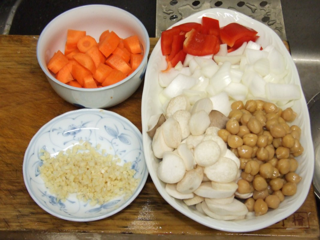 今回は人参はサイコロ大、玉葱はザク切り、エリンギは輪切り、にんにくのみみじん切りです。