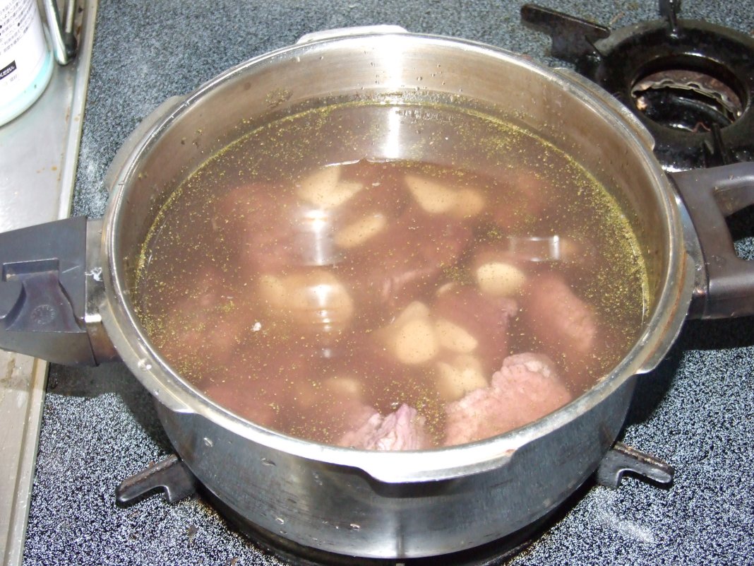 ここでは圧力鍋は7分程度で十分です。最初だけは強火~中火、蒸気を吹き始めたら弱火で。