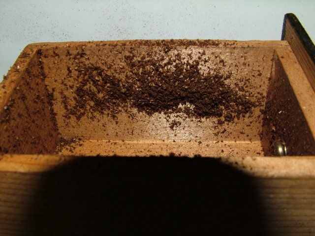 コーヒーミルで挽いた直後、シルバースキンと微粉がミルの粉ケースに静電気で張り付いてます。