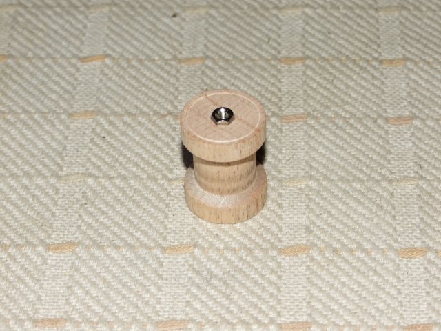 ジョイフル本田の工作用品コーナーで売ってる木製の糸巻きをロングナットに合わせてヤスリでゴリゴリ削って整形します。