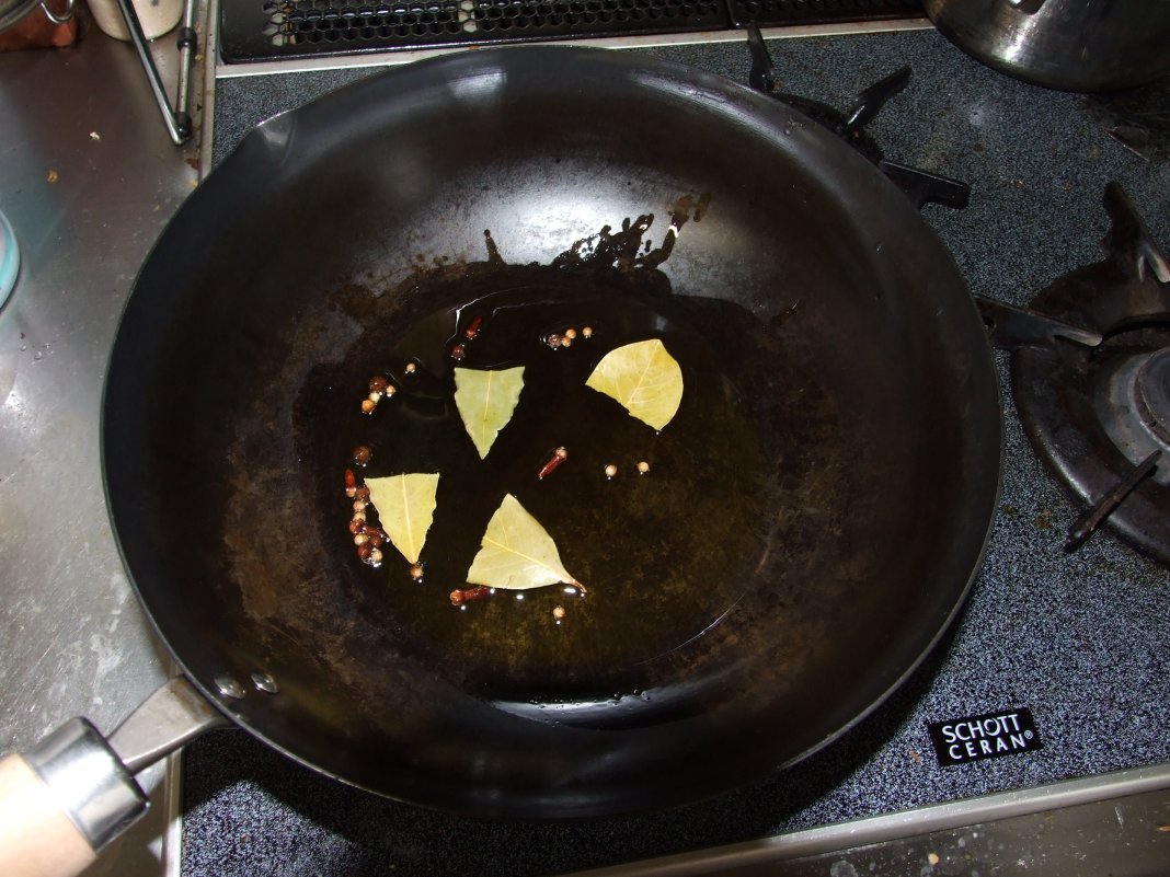 右下のスパイスは後述するテンパリング用のスタータースパイスです。ローレル二枚分、クローブ、コリアンダー、オールスパイスをそれぞれひとつまみ。