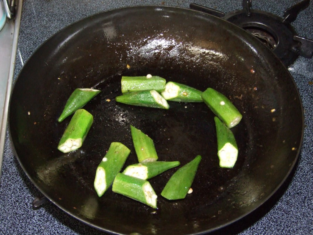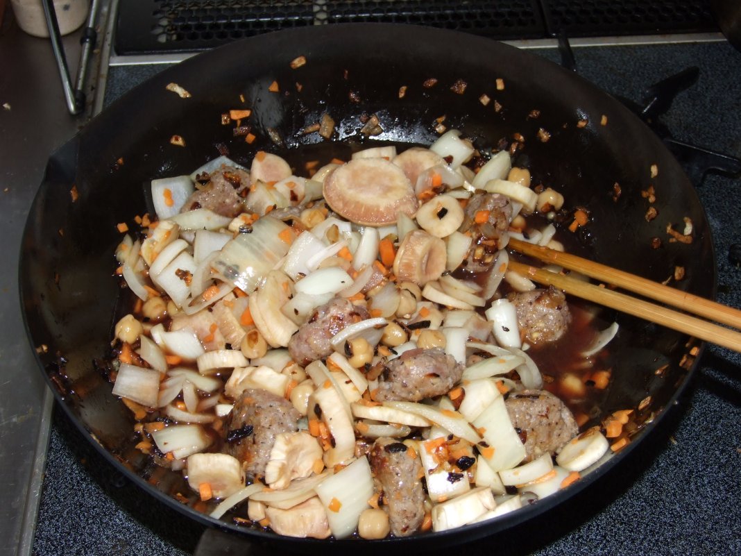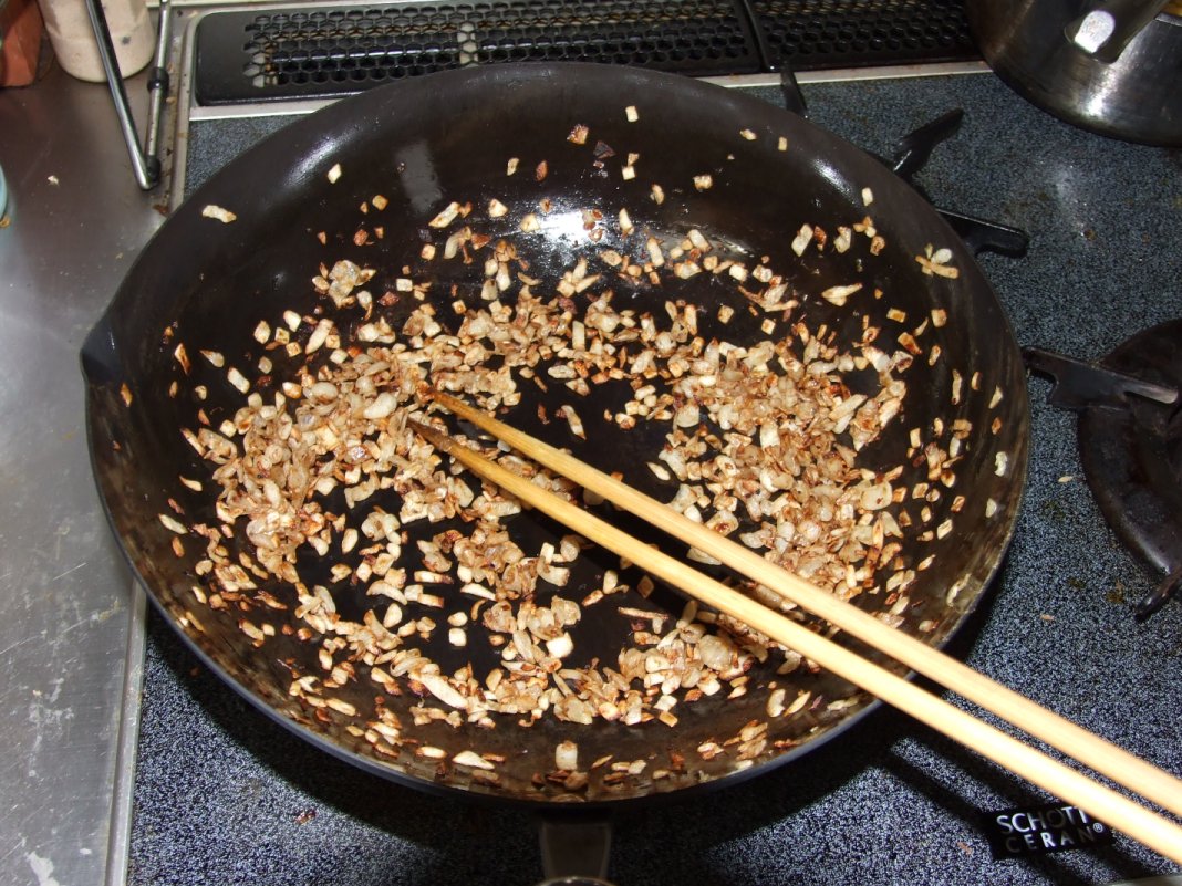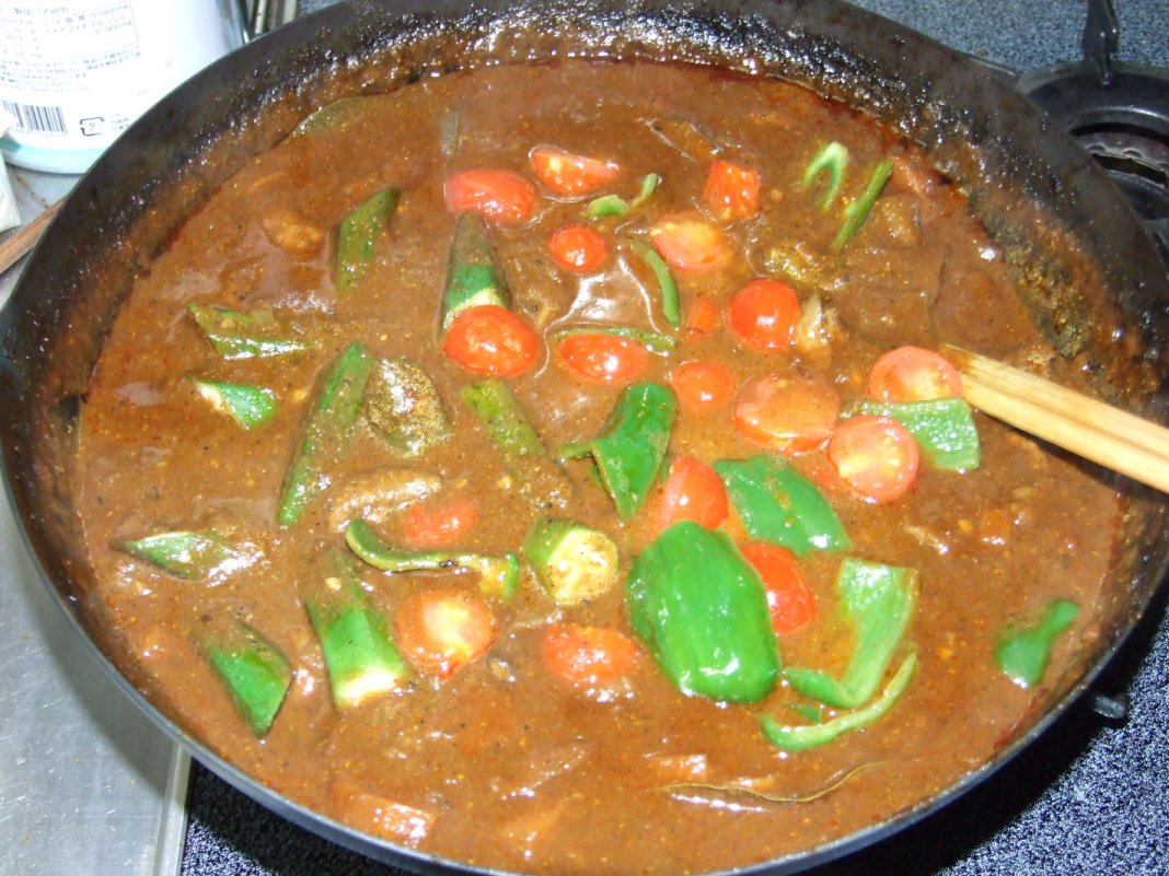 アメタマが出来たら、テンパリングで作ったスパイス油を入れて、細切れ肉と野菜を炒めます。