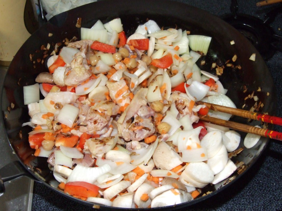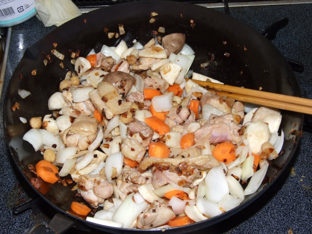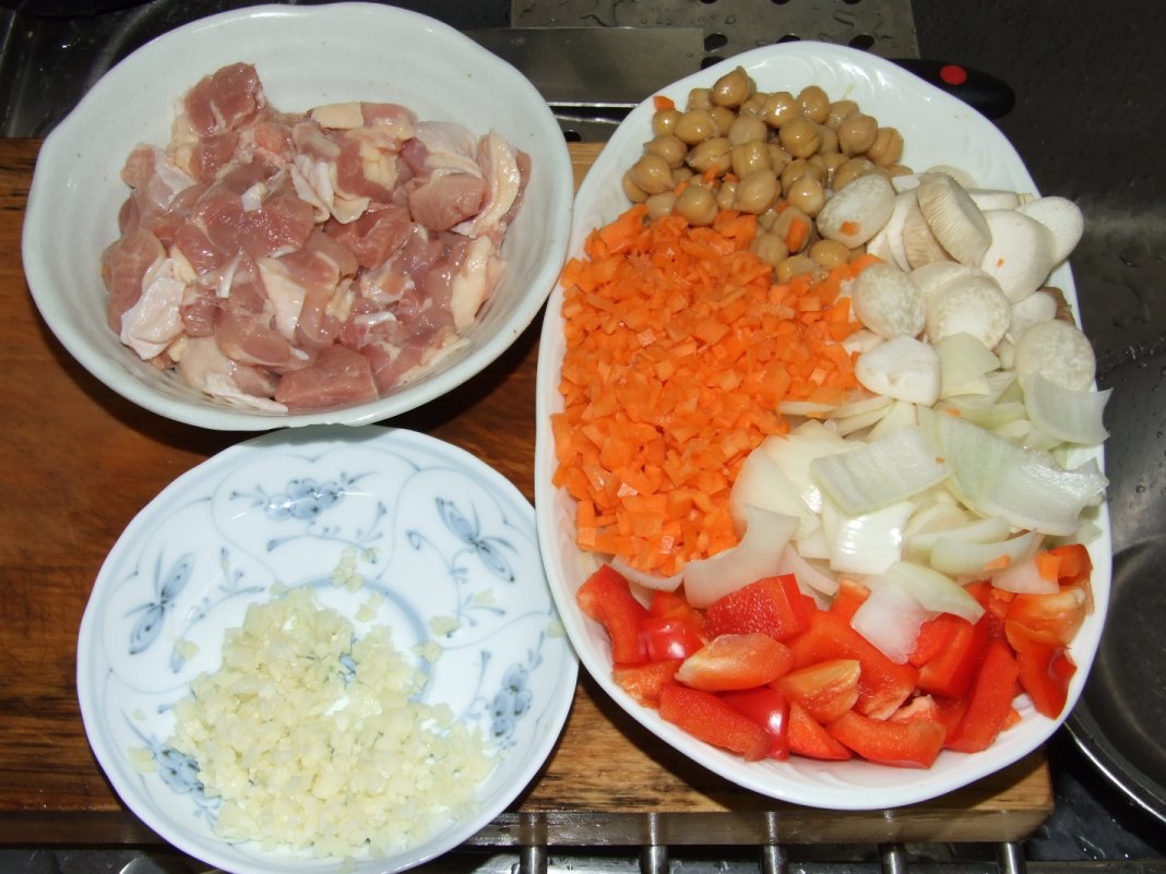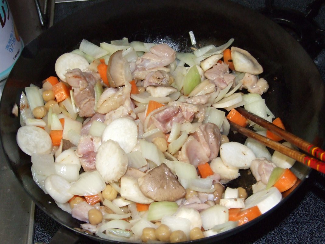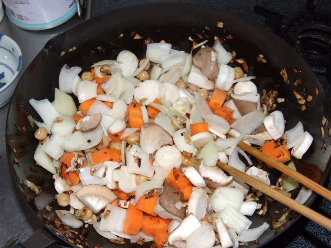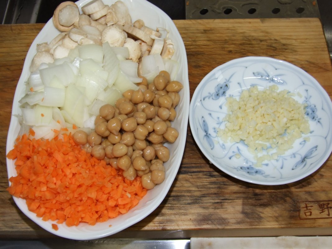 順番は、肉→硬い野菜(ここでは人参)→柔らかい野菜(ここでは玉葱エリンギひよこ豆)の順番です。
