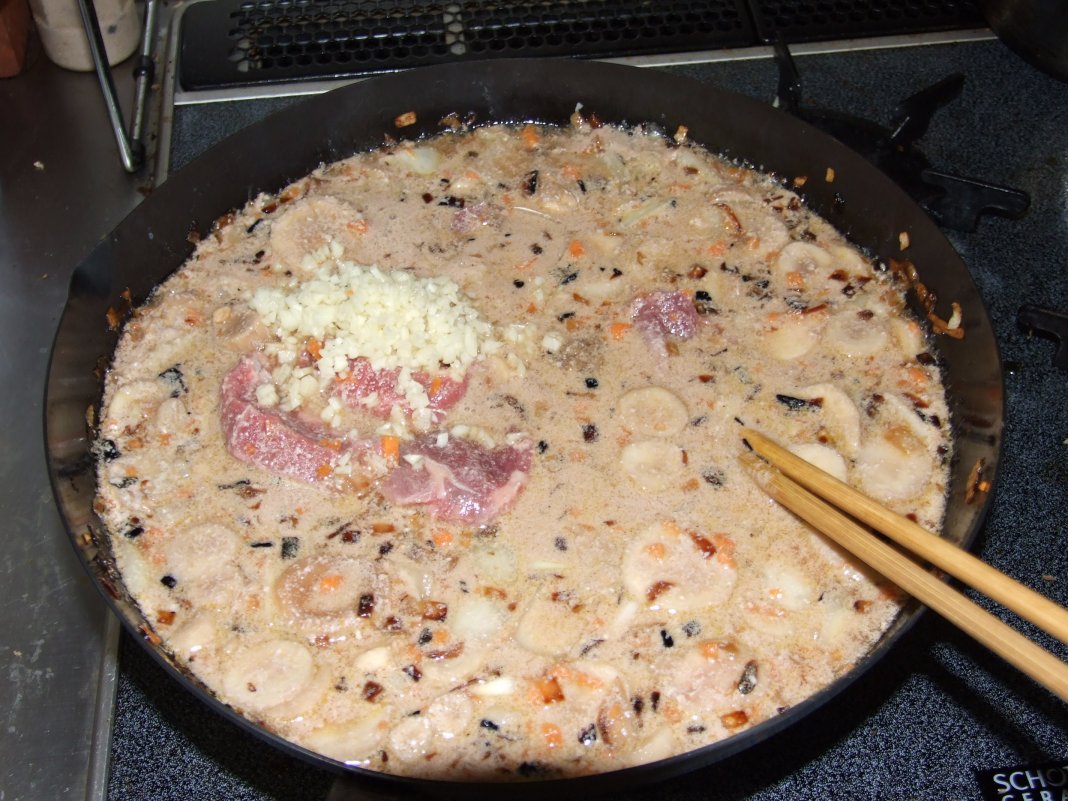 肉を敷き詰め、さっき作ったカレーから出来るだけ具が入らぬようにスープのみを300ccほど入れ、更に水を300ccほど混ぜます。