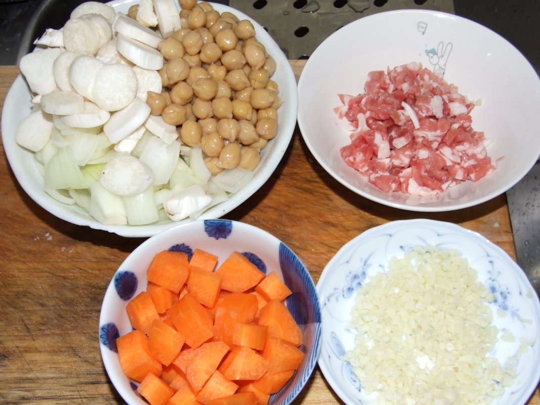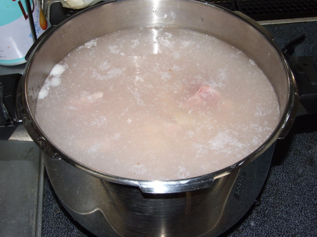 これを、全部圧力鍋に入れて、水をたっぷりと。