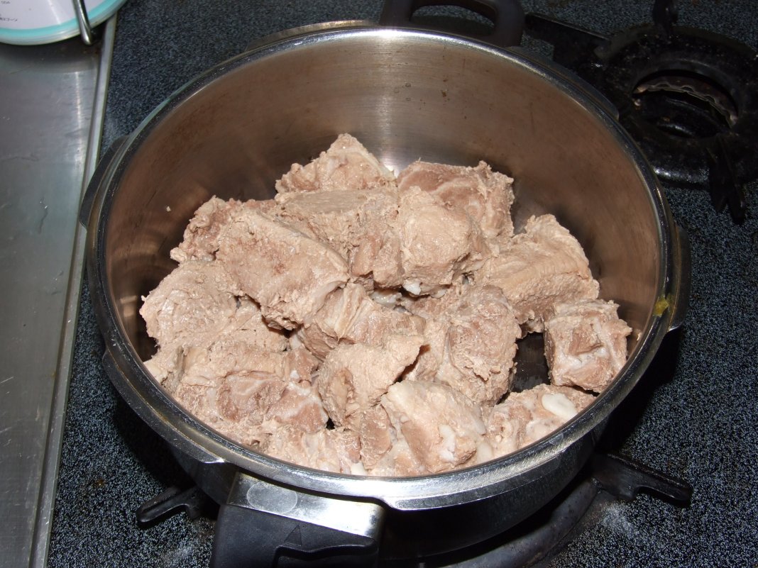 これは1900グラム分(実際にはずっと軽くなっています)なので、半分はごく普通の角煮にしてもらうために母親にバトンタッチ。