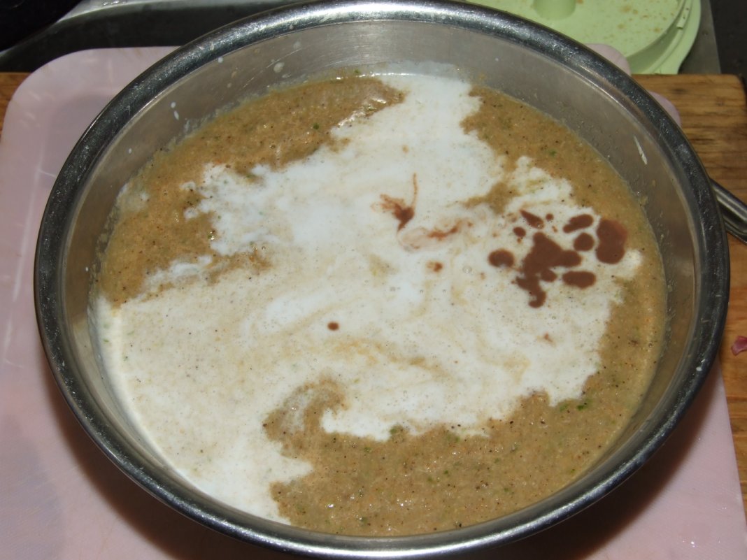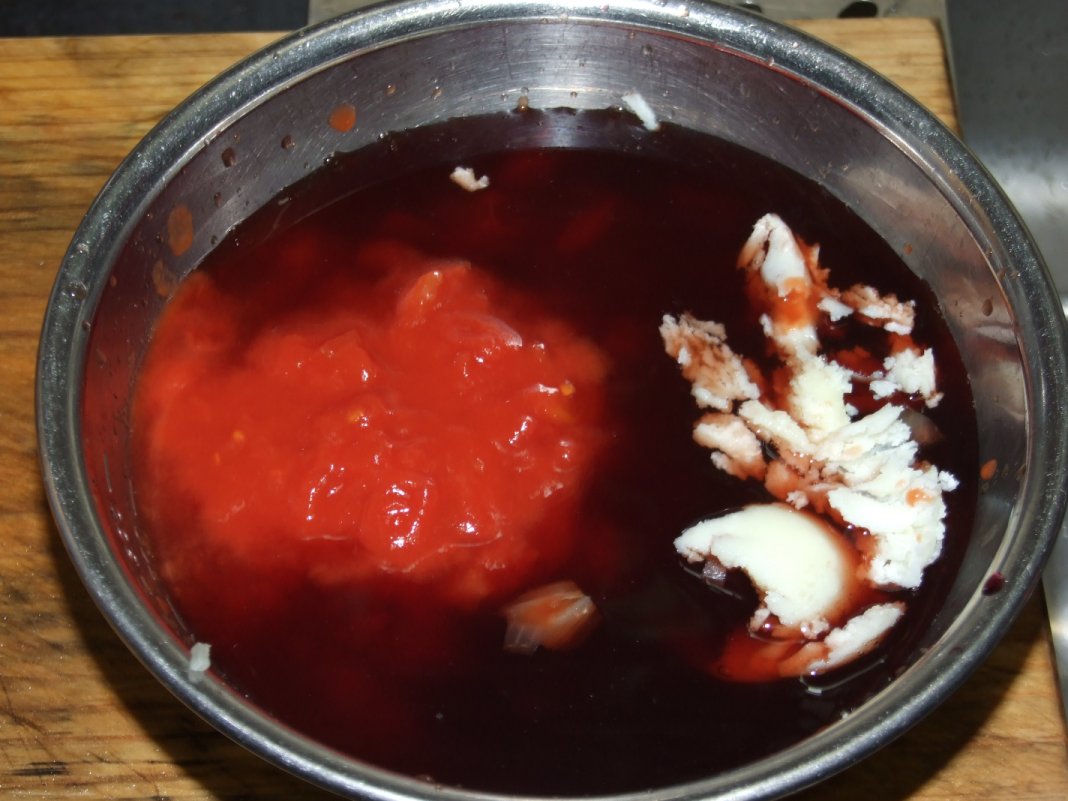 カットトマト缶詰、水、鶏がらスープ、赤ワイン、コーヒー、ギー(インド発酵バター)、マンゴチャツネ、すりおろし生姜、そして後述するアメタマの副産物である玉葱の絞り汁を一つのボウルに入れて軽く混ぜておきます。