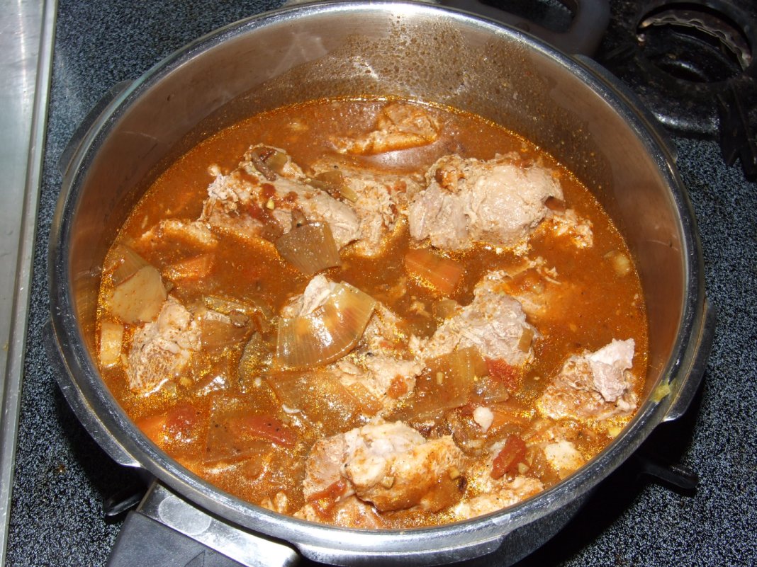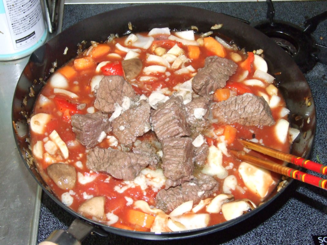 味が整ったら改めて肉を投入、冷えて硬くなってる肉を緩める意味も兼ねて、4分間x3セット煮込みました。